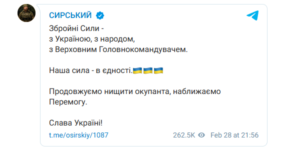 Во објава на Телеграм, Сирски напиша дека „вооружените сили стојат со Украина, народот и врховниот командант Зеленски“.