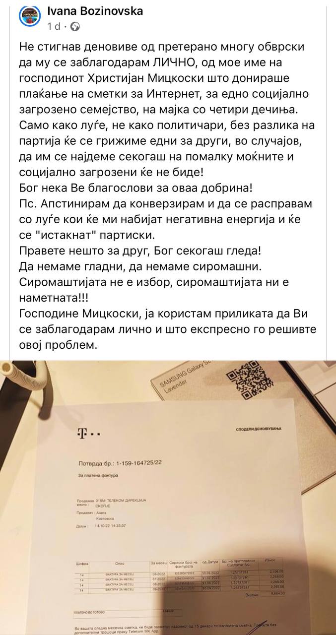 -Не стигнав деновиве од претерано многу обврски да му се заблагодарам ЛИЧНО, од мое име на господинот Христијан Мицкоски што донираше плаќање на сметки за Интернет, за едно социјално загрозено семејство, на мајка со четири дечиња.