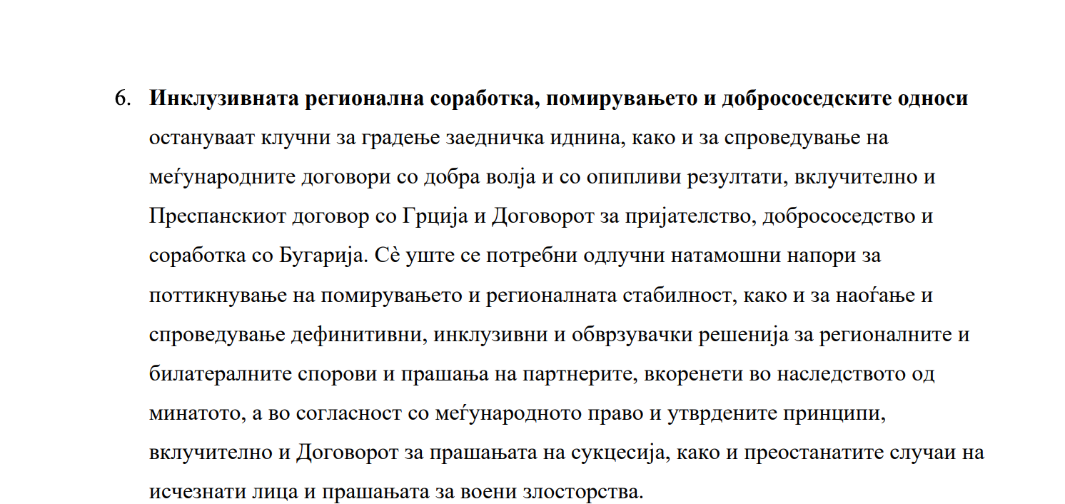 Документот става посебен акцент на регионалната соработка, помирувањето и добрососедските односи како неопходни компоненти на патот на проширување и создавањето заедничка европска иднина. Во овој контекст, ЕУ ја нагласува важноста на вистинското и ефикасно спроведување на обврзувачките меѓународни договори, вклучувајќи го Преспанскиот договор со Грција и Договорот за пријателство и добрососедство со Бугарија, кои Северна Македонија се обврзѕва да ги почитува.