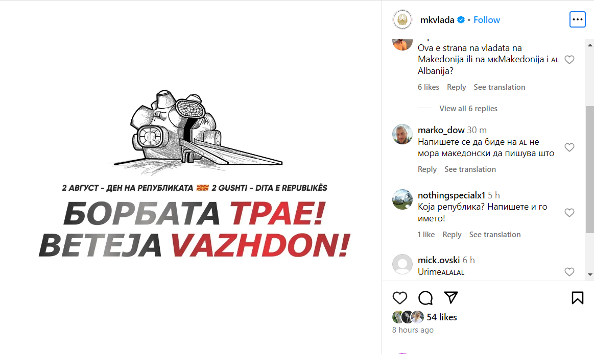 Иако Владата на Христијан Мицкоски најавуваше борба проив таканаречената албанизација на Македонија пред малку на официјалната страница на Инстаграм на Владата осамна слоганот за најголемиот македонски празник 2 август Илинден и на албански.
