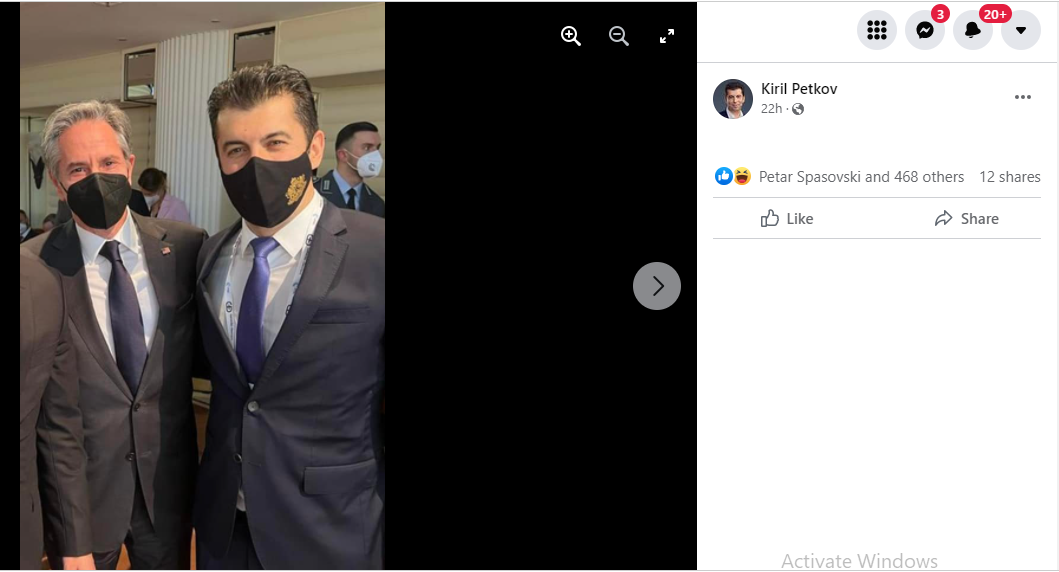 Тројцата државници всушност позираа заедно, но подоцна на Фејсбук Петков го „исече“ Ковачевски од фотографијата, за да во кадарот биде сам со Блинкен.