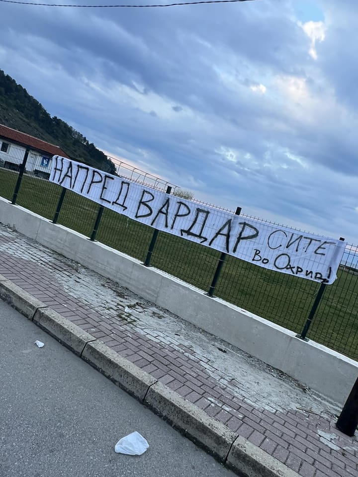 „Напред Вардар. Сите во Охрид“, е пораката на транспарентот кој Комитите го поставија на оградата на тренинг центарот на ривалот.