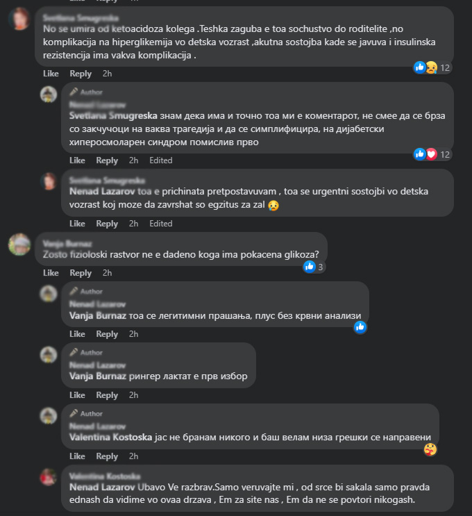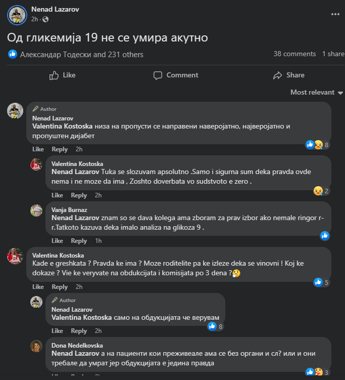 Докторот Ненад Лазаров во статус на Фејсбук вели „Од гликемија 19 не се умира акутно“.