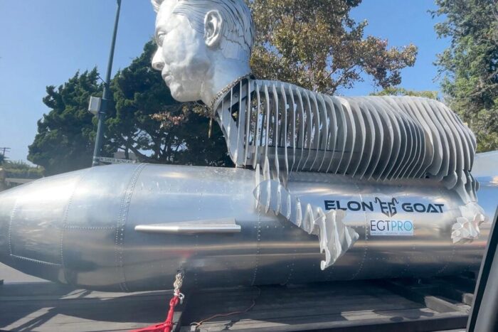 Алуминиумскиот споменик ја прикажува главата на најбогатиот човек на светот прикачена на телото на коза додека седи на ракета. Козата е таму како асоцијација со терминот GOAT (преведено од англиски goat, но и кратенка за „Greatest Of All Time“).