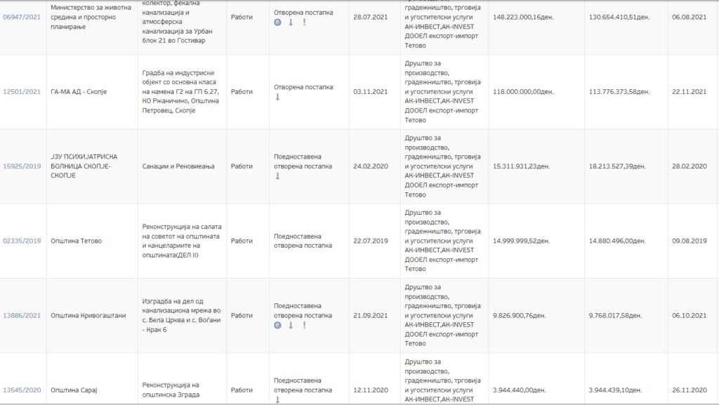 Според Бирото за јавни набавки, фирмата склучила повеќе договори за јавна набавка со органи предводени од кадри на ДУИ, при што најголем е договорот со Министерството за екологија за изградба на фекална и атмосферска канализација во Гостивар, вреден 130 милиони денари.