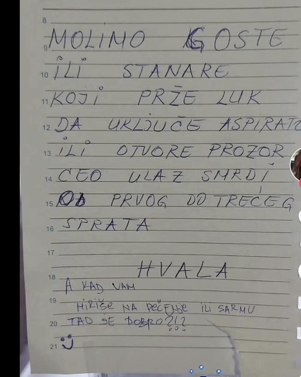 – Ги замолуваме гостите или станарите кои пржат кромид да го вклучат аспираторот или да го отворат прозорецот. Целиот влез смрди, од првиот до третиот кат. Благодарам, стои во пораката испишана со пенкало, а која била залепена во влезот од зградата на Златибор.