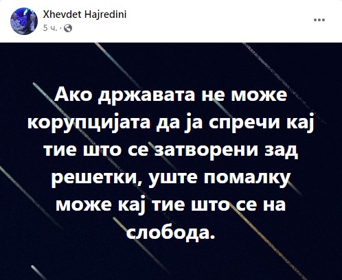Ако државата не може корупцијата да ја спречи кај тие што се затворени зад решетки, уште помалку може кај тие што се на слобода, коментира поранешниот министер Џевдет Хајредини.