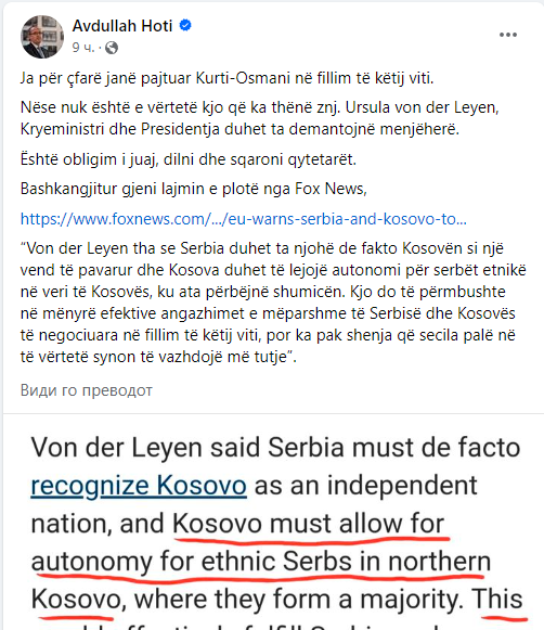 „Еве на што се договорија Курти и Османи на почетокот на оваа година. Доколку тоа што го изјави Урсула фон дер Лајен не е точно, премиерот и претседателот на Косово мора веднаш да го демантираат. Ваша должност е да излезете и да му објасните граѓаните“, напиша Хоти.
