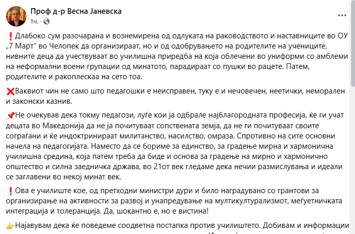 Длабоко сум разочарана и вознемирена од одлуката на раководството и наставниците во ОУ „7 Март“ во Челопек да организираат, но и од одобрувањето на родителите на учениците, нивните деца да учествуваат во училишна приредба на која облечени во униформи со амблеми на неформални воени групации од минатото, парадираат со пушки во рацете. Патем, родителите и ракоплескаа на сето тоа.