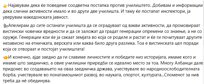 Апелирам до сите останати училишта да се оградуваат од вакви активности, да промовираат вистински човечки вредности и да се заложат да градат генерации опремени со знаење, а не со оружје. Генерации кои ќе ја сакаат земјата во која се родиле и растат и ќе ги почитуваат другите независно на етничката, верската или каква било друга разлика. Тоа е вистинската цел поради која се отвораат и постојат училиштата!