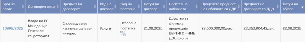 Јавната набавка е спроведена од генералниот секретаријат на Владата и е во времетраење од 12 месеци.