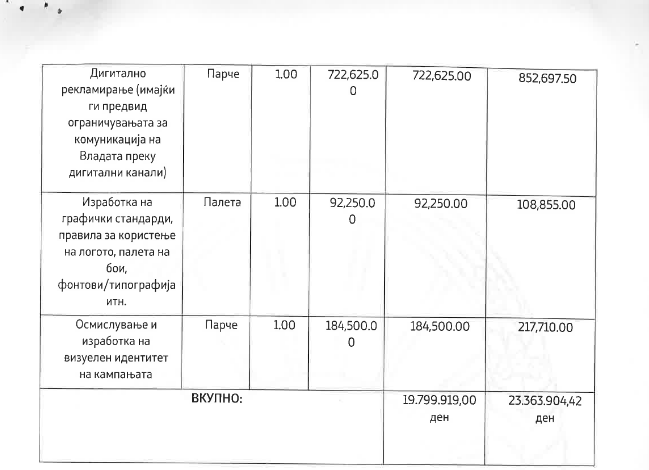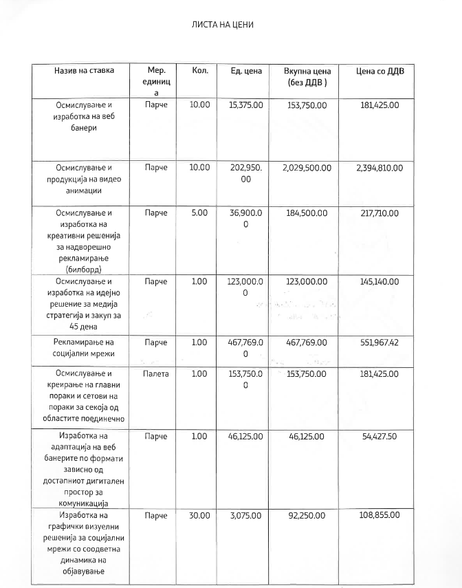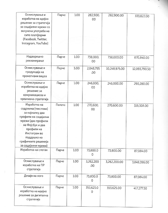 Осмислување и продукција на една видео анимација чини 202.000 денари, ПР стратегијата чини 3.2 милиони денари.