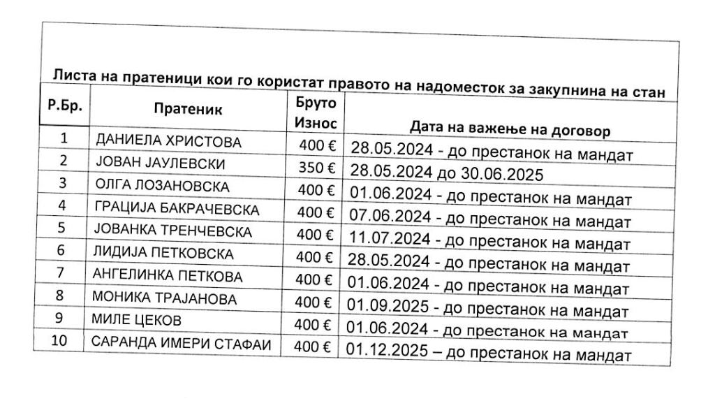 Има и пратеници на кои Собранието им плаќа закупнина за стан. Во продолжение пратениницте кои го користат ова право.