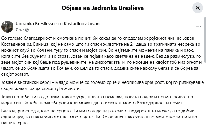 Со голема благодарност и емотивна почит, би сакал да го споделам херојскиот чин на Јован Костадинов од Виница, кој не само што ги спаси животите на 21 деца во трагичната несреќа во ноќниот клуб во Кочани, туку го спаси и мојот син, пишува мајка на преживеано дете од трагедијата во Кочани.
