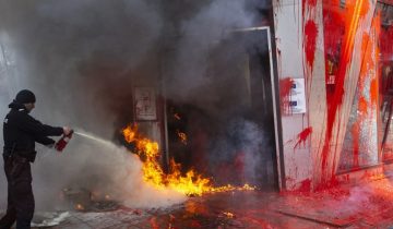 Демонстрантите потоа ја запалија вратата од зградата…