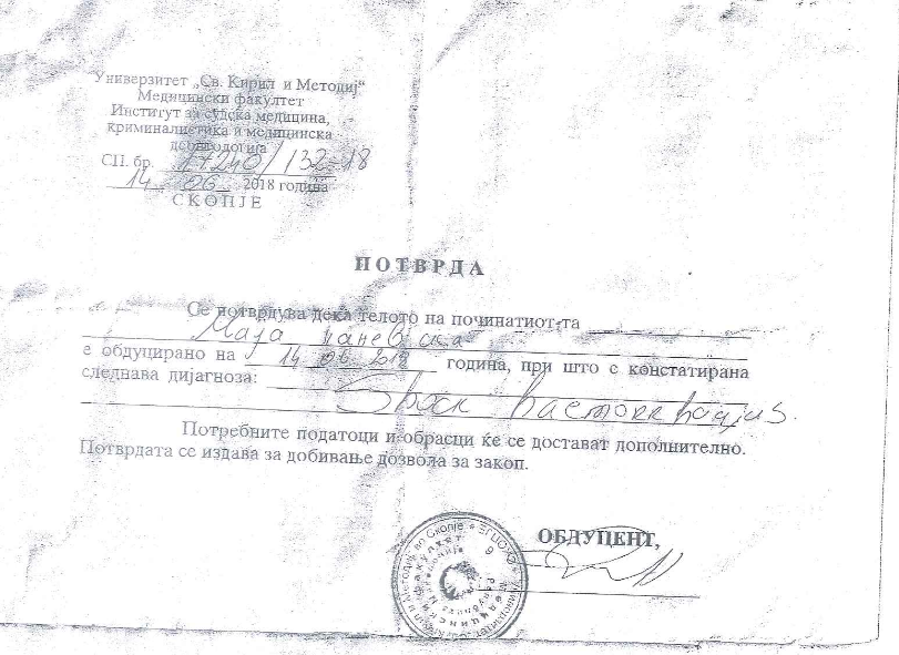 Првиот документ кој семејтвото го добива по смртта на Маја е потврдата од судска медицина по извршената обдукција, каде се наведува дека смртта настанала како резултат на хеморагичен шок, односно искрварување. Ова било шок за семејството, бидејќи претходно им било кажано дека станува збор најверојатно за тромб кој се откачил после породувањето.