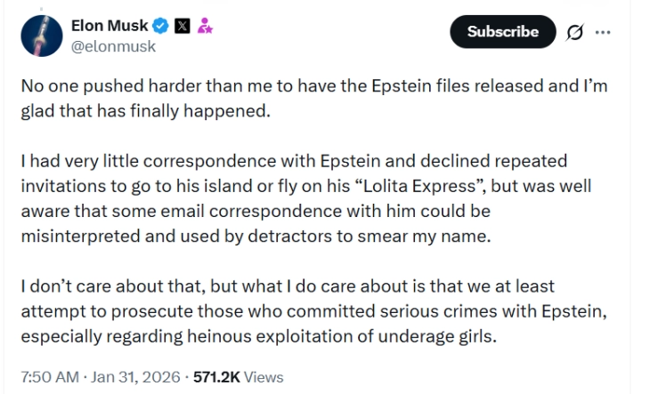 Маск на Х наведе дека имал многу ограничена комуникација со Епстин и дека одбил повеќекратни покани да го посети неговиот остров или да патува со неговиот авион.