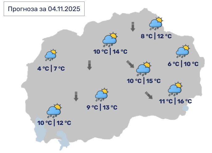 Во Скопје, променливо облачно претпладне со повремен слаб дожд. Ќе дува умерен, повремено засилен ветер од северен правец.