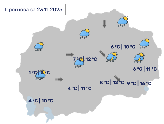 Денес ќе се задржи променливо облачно време со повремени врнежи од дожд. Наместа врнежите ќе бидат пообилни (над 40 l/m² за 24 часа), локално во форма на невреме со засилен ветер и појава на грмежи. Утре поради продор на постудена воздушна маса на повисоките планини врнежите од дожд ќе преминуваат во врнежи од снег.