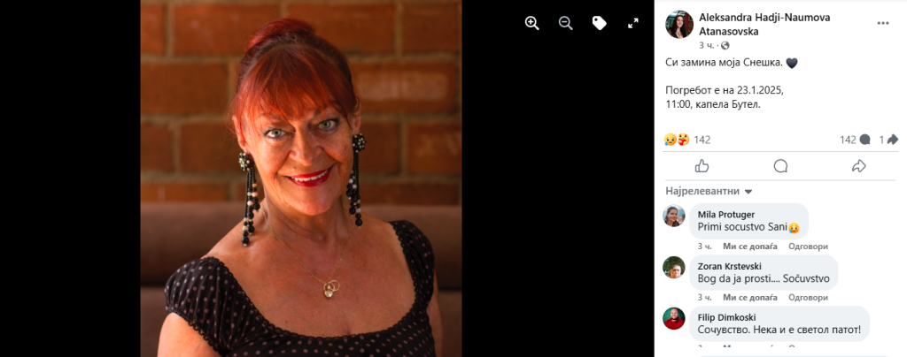 Почина легендарната ТВ спикерка Снежана Липковска, доајенот на македонското спикерство. Поседуваше фантастичен радиофоничен глас, продорни крупни зелени очи, совршена дикција, шарм, ненаметливост, интелект и стил.