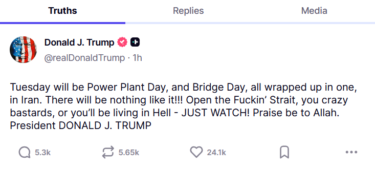 – Вторник ќе биде Ден на електраните и Ден на мостовите, сè заедно, во Иран. Нема да има ништо слично!!! Отворете ја прокелетата теснина, луди гадови, или ќе доживеете пекол – САМО ГЛЕДАЈТЕ! Слава му на Алах, напиша Трамп на својата социјална мрежа Truth Social.
