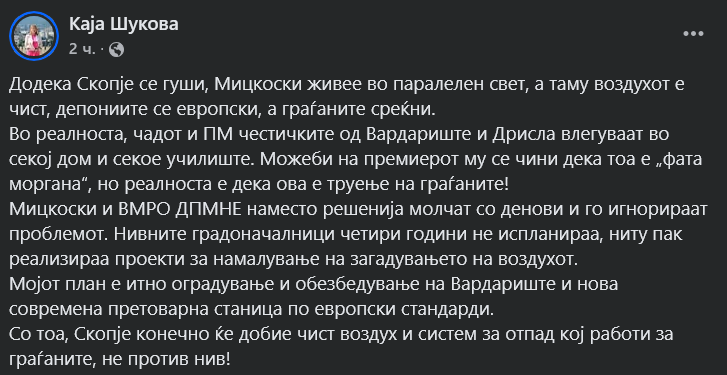 Кандидатка за градоначалник на Скопје, Каја Шукова реагира на изјавата на премиерот Христијан Мицкоски кој денеска рече дека испитуваните параметри на штетни честички не покажуваат алармантни вредности на загаден воздух во Скопје. Шукова на својот профил на Фејсбук истакна дека Мицкоски заедно со градоначалниците од ВМРО ДПМНЕ да не живеат во ,,фата моргана”, бидејќи во мандатот од 4 години не направиле ништо за да ги заштитат граѓаните.